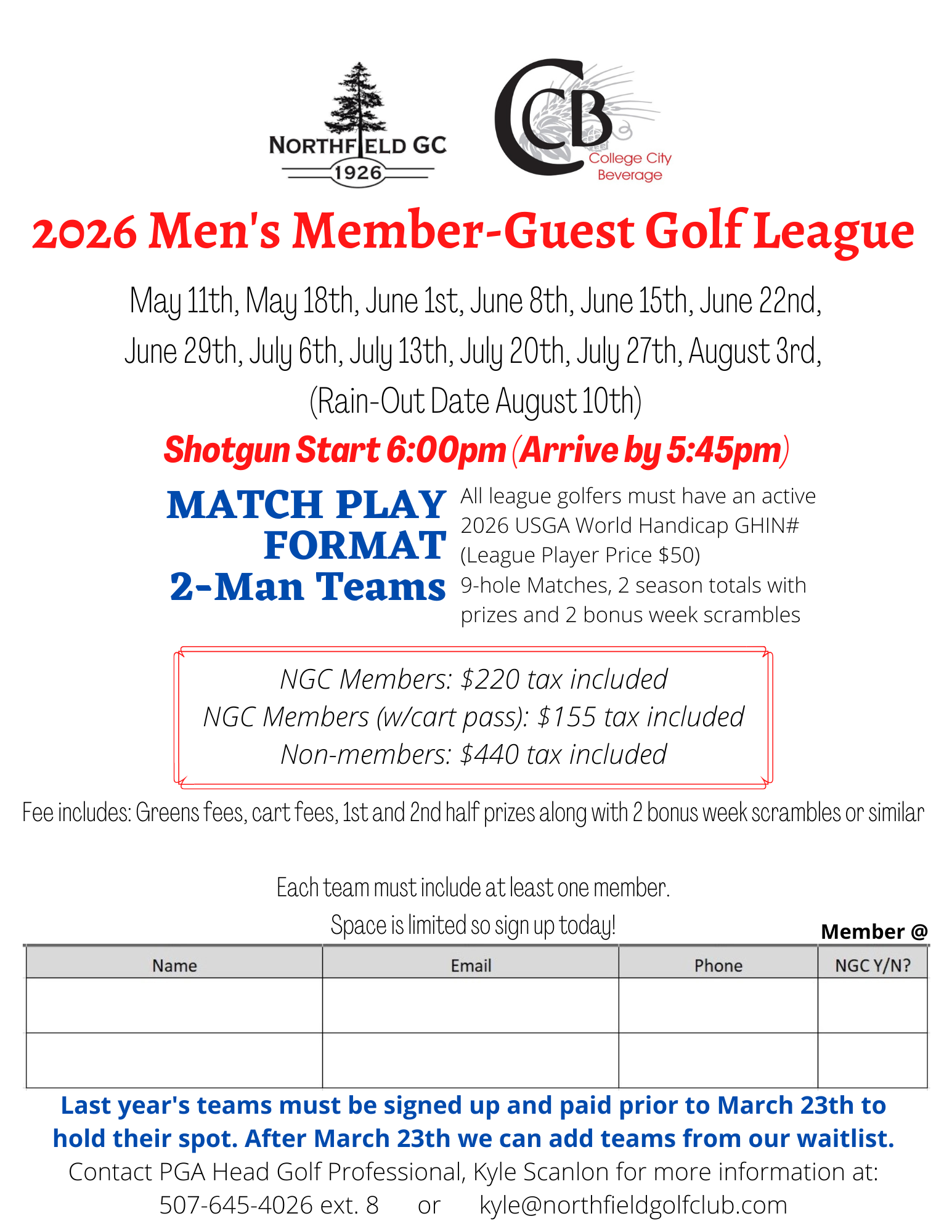Come and join us for our Monday Night Member-Member/Member-Guest Men's League sponsored by College City Beverage. This 2026 League is match play and will begin on Monday, May 11th at 6:00 PM, and adjust starting based on sunlight as the season continues. The league will run for 12 weeks. This is a 2-person team league so grab a buddy and sign up now. This league fills up quickly so join now to assure your spot. Contact Head Golf Professional, Kyle Scanlon at 507.645.4026 ext. 8 or This email address is being protected from spambots. You need JavaScript enabled to view it. or phone the Golf Shop ext.1 for more information or to sign up!