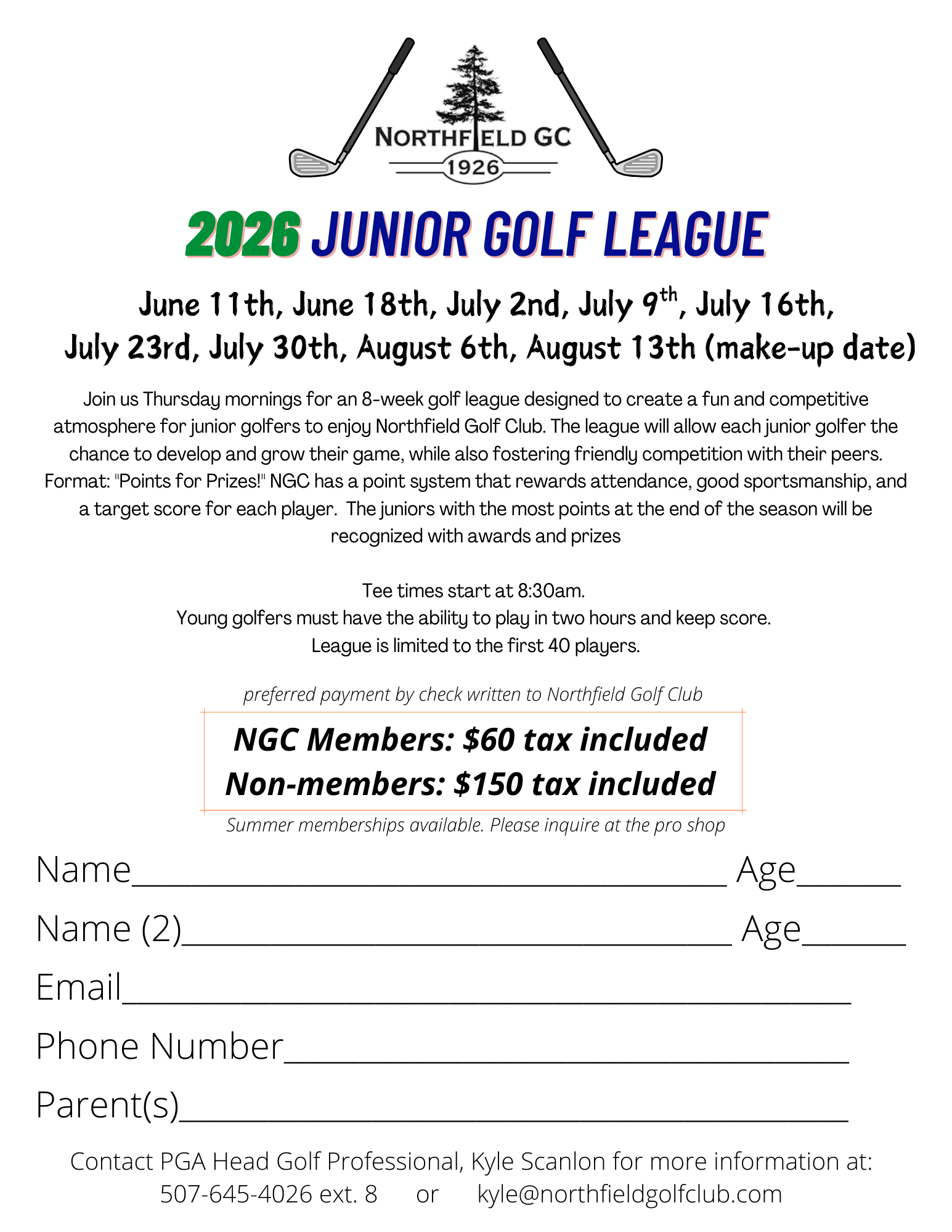 Northfield Golf Club has a league for young golfers starting at age 7. Thursday tee times begin at 8:30am. Our structured league setting provides for a more popular, less stressful competition. The emphasis is on the fun, recreation, and sportsmanship of the game for players at any skill level where every participant gets the chance to play. 2026 League play will begin Thursday, June 11th with morning tee times and continues for a total of 8 weeks. Young golfers must be able to play 9 holes in 2 hours and keep score with a 2026 format of "Points for Prizes" that rewards attendence, good sportsmanship and a target score for each player. There's a 40 player limit so sign up early. Contact Head Golf Professional, Kyle Scanlon at 507.645.4026 ext. 8 or This email address is being protected from spambots. You need JavaScript enabled to view it. or the Golf Shop ext.1 - sign up today!