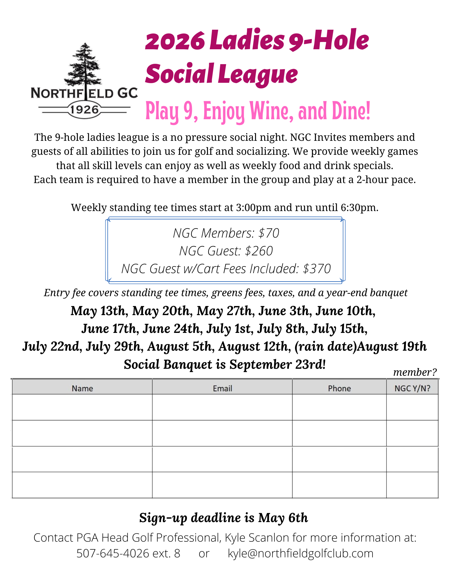 Are you interested in playing in a no pressure ladies only league? How about a Nine-Wine-Dine League? Do you want to play with friends for fun and socializing in a golf setting? We offer 9-hole tee times starting between 3:00p and 6:30p on Wednesday evenings. 2026 League will kick off Wednesday, May13th and runs for a total of 14 weeks plus a Finale Banquet September 23rd. Each team is required to have a Northfield Golf Club Member. Limited spots, so sign up early! Also, please check our calendar for other ladies only events the club will be hosting throughout the season, they are guaranteed to be lots of fun! Contact Head Golf Professional, Kyle Scanlon at 507.645.4026 ext. 8 or This email address is being protected from spambots. You need JavaScript enabled to view it. or the Golf Shop ext.1 for more information - sign up today!
